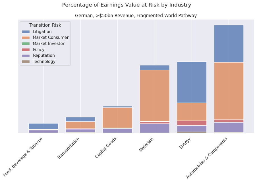 Figure 2 – A comparison of the six industries with the highest percentage earnings value at risk for very large German companies.  Interestingly, the absolute risk for Automobiles and Components is lower than for Energy but because the underlying earnings value of energy is higher, the percentage earnings value at risk is higher for Automobiles and Components.