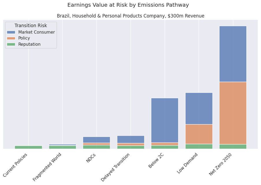 Figure 1 – A comparison of the three most material transition risks for a Brazilian Household and Personal Products company with a revenue of $300m.  The size and relativity of the risks varies across pathways.