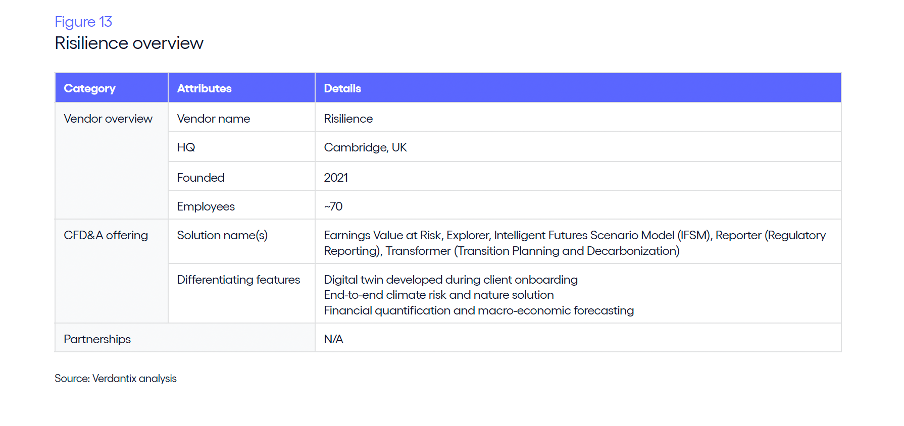 Profiled as one of 10 key vendors of climate, financial data and analytics solutions, Risilience is highlighted for providing: